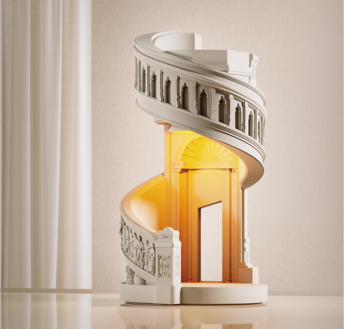 - Golden Inner Glow: Light spirals upward from the base, evoking the timeless grandeur of a European library staircase.