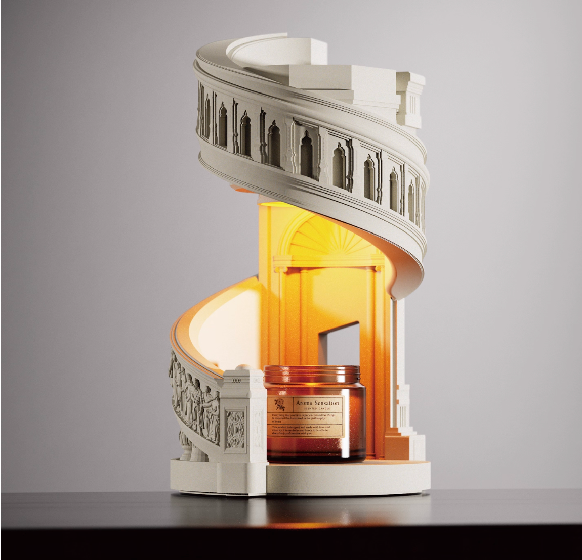 while warm light cascades through intricate balustrades—gently melting scented wax within.