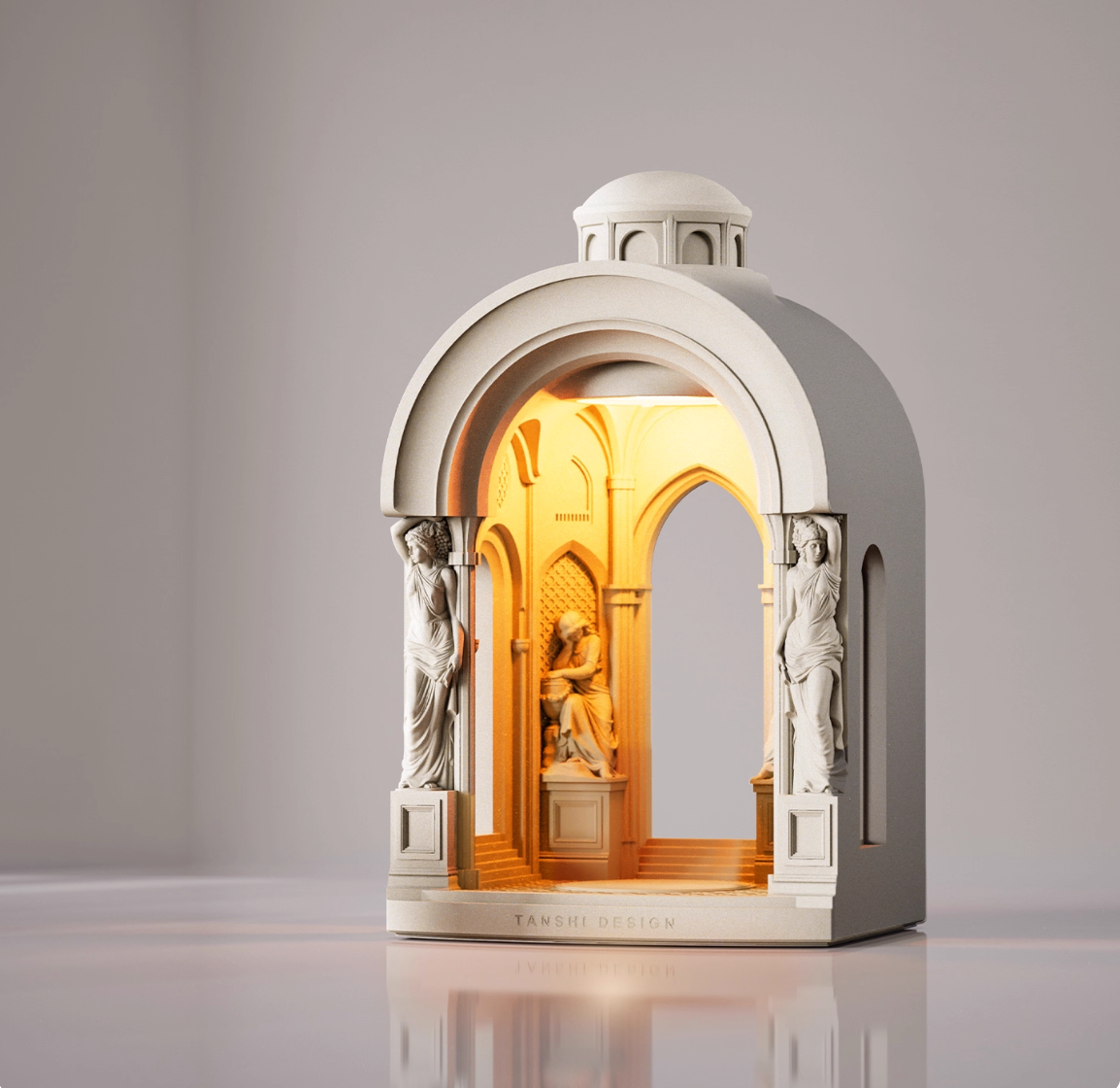 Layered Light Diffusion: Light spills through tiered internal structures, evoking the solemn glow of a neoclassical chapel at twilight.
